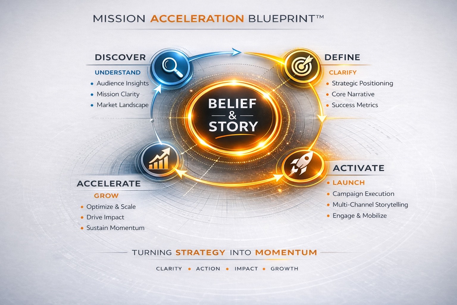 Mission Acceleration integrates strategic clarity, story architecture, and campaign execution into one unified system designed to transform attention into action.
